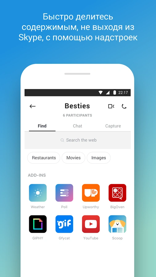 Приглашайте в Скайп всех своих родственников и друзей, чтобы совершать звонки. Переписывайтесь, отправляйте эмодзи, совершайте видеозвонки и всегда оставайтесь на связи. Делитесь любым типом контента и выражайте свои эмоции онлайн.